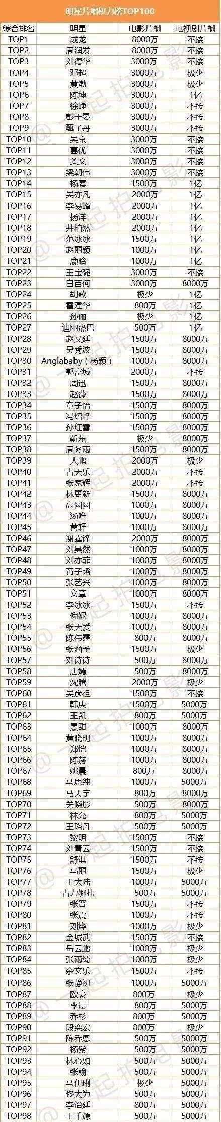 Remark 2: Chinese actor paid rankings in 2017 by The South China Morning Post (in million US dollars)